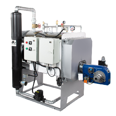 بویلر این پکیج از نوع سه پاس پلاس (Three Pass Boiler) و Fair Tub طراحی شده است. ساختار سه پاس به معنای عبور دود و گازهای ناشی از احتراق از سه مسیر مختلف داخل بویلر است که موجب انتقال حرارت بیشتر به آب و افزایش راندمان حرارتی میشود. در عین حال، ساختار Fair Tub باعث بهینه شدن فضای داخل بویلر و افزایش طول عمر با کاهش تنشهای حرارتی میشود. بدنه بویلر از فولاد با ضخامت ۶ میلیمتر ساخته شده که مقاومت بالا در برابر فشار و دمای زیاد دارد. استفاده از عایقهای حرارتی پشم سرامیک مقاوم تا ۸۰۰ درجه سانتیگراد نیز از اتلاف حرارت جلوگیری میکند و باعث صرفهجویی انرژی قابل توجهی میشود.