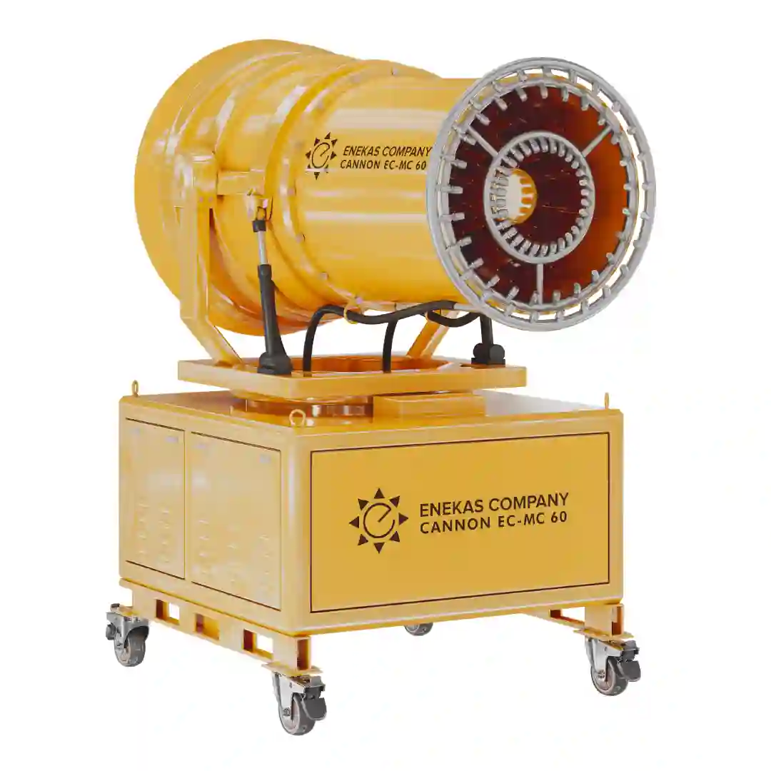 چرخش افقی 180 درجه؛ پوشش نیمدایرهای بدون جابهجاییزاویه چرخش افقی 180 درجه در مهپاش کنون EC‑MC 60 امکان پوشش یک نیمدایره وسیع را بدون جابهجایی فیزیکی دستگاه فراهم میکند. این ویژگی برای محوطههای بزرگ، رمپهای بارگیری، حیاط کارخانهها و معادن بسیار ارزشمند است؛ جایی که دستگاه میتواند با حرکت رفت و برگشتی خود، سطح گستردهای را زیر پرده مه قرار دهد. این زاویه چرخش، در هماهنگی کامل با پرتاب 60 متری و حجم هوادهی بالا تنظیم شده تا در هر اسکن افقی، حداکثر فضای ممکن مهپاشی شود. برای اپراتور، این یعنی کاهش نیاز به نصب یا جابهجایی چند دستگاه و سادهتر شدن مدیریت سیستم.